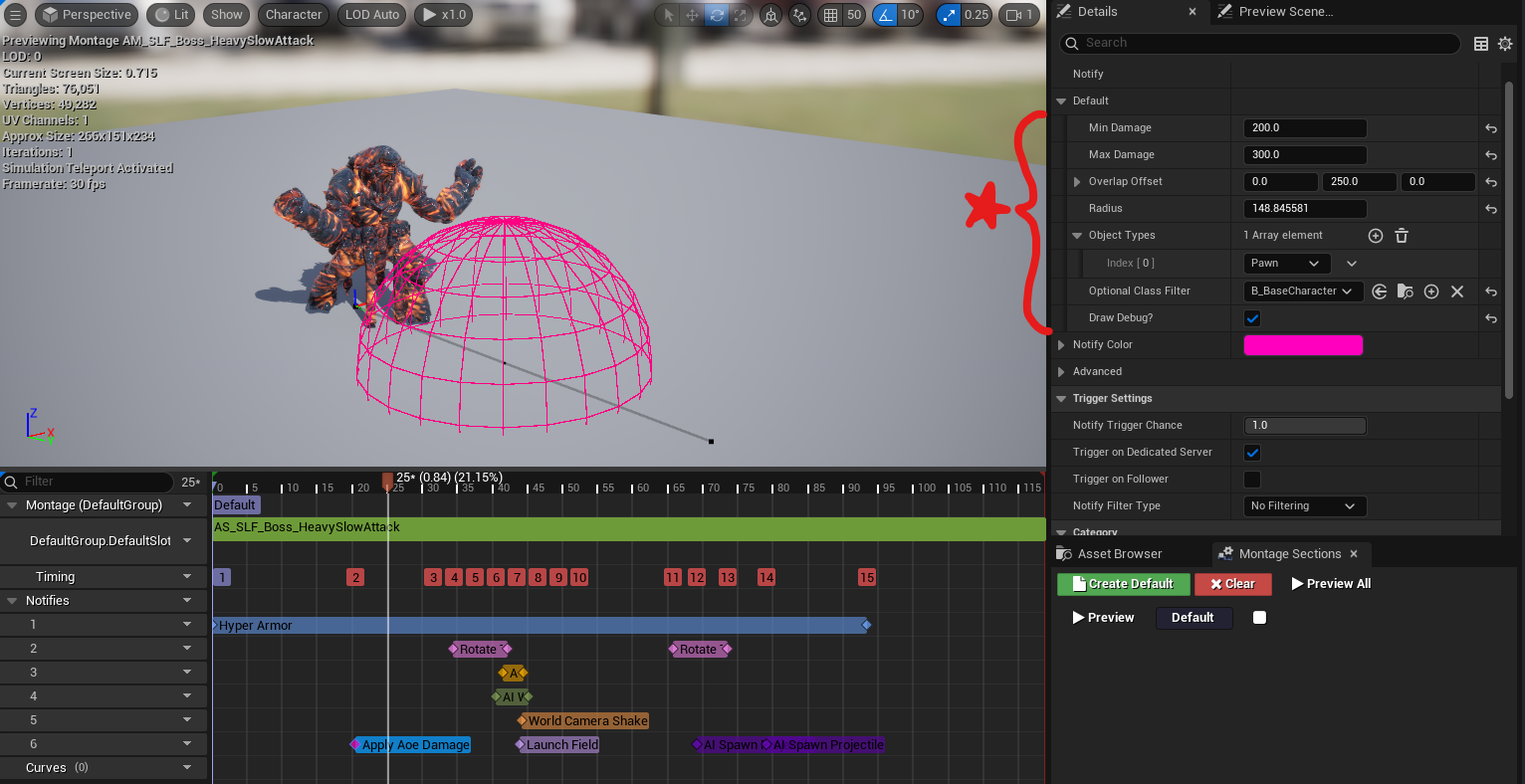 This is an example notify that is not utilized in the demo but is there for you to use out the box. It does a basic sphere overlap for the desired Object Types/Classes with the desired radius, and applies a random damage from the Min/Max damage inputs.